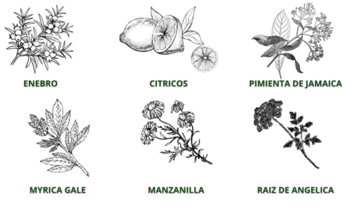 ES EL RESULTADO DE DESTILAR ARTESANALMENTE 12 BOTÁNICOS MINUCIOSAMENTE SELECCIONADOS. DENTRO DE SUS BOTÁNICOS SE ENCUENTRA MYRICA GALE, SU CORAZON, UNA JOYA BOTÁNICA POCO COMÚN